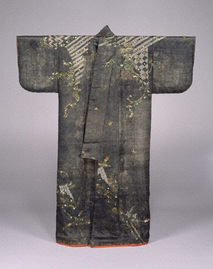名称 黒紅地花卉文様繍箔小袖