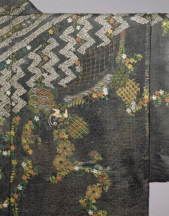 菊花入り卍繋ぎ文の黒綸子地に、鹿子絞りで斜縞や敷瓦などを、金摺箔で霞や花唐草、刺繍で蔦花や菊、松樹、片輪車、鶴亀、杜若などの文様を、全体に精緻に表した典型的な慶長小袖の作品である。金摺箔に剥落が多く認められるものの、表地の仕立てには後補が見られない保存状態が良好な遺例であり、江戸時代初期(一七世紀前半)の小袖の実態を知るうえできわめて貴重である。